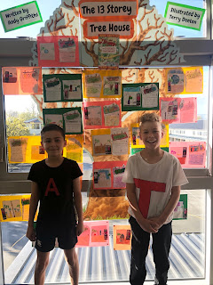 This term for the Book Week window display competition Homebase 4 dmade a window display of The 13 Storey Treehouse book by Andy Griffiths and Terry Denton. The book is about two boys named Andy and Terry. They live in a tree now when I say tree I mean treehouse and when I say treehouse I don’t mean any old treehouse I mean a 13 storey treehouse. We made our own creative levels that we thought would be a good addition, then we put them on the tree. Then we went to assembly and you wouldn't believe it, but we won first place in the window display contest because of our hard work.